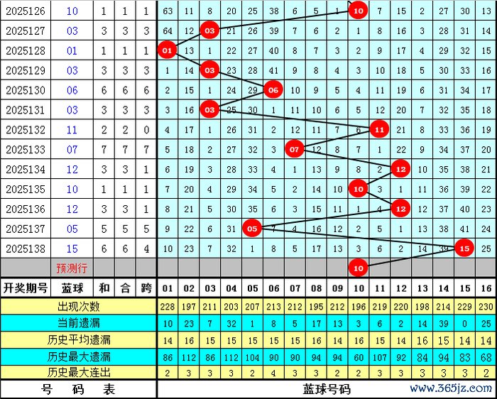 蓝球号码分析:上期蓝球为15,开出0路号码,蓝球最近10期012路比为6:2:2,最近30期012路比为12:11:7,最近100期012路比为30:38:32,本期蓝球看好1路号码,四码蓝球参考01、04、10、13。