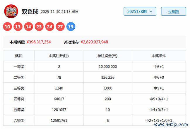 开奖回来:双色球第2025138期奖号为:10 13 14 23 24 27 + 15,其中红球号码奇偶比为3:3,大小比为3:3,012路比为2:2:2,三区比为1:2:3。