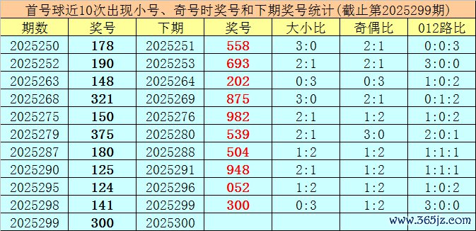 在首号球前10次开出小 号、奇号类型之后,其下期分辨开出奖号:558、693、202、875、982、539、504、948、052、300,其中号码奇偶比为6:4,大小比为7:3,012路比为5:0:5。